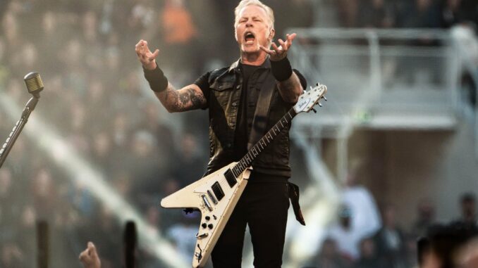 Following Lars Ulrich’s four-count, Hetfield and Kirk Hammett enter with the track’s suspenseful opening power chords – armed with a black ESP Snakebyte and Jackson Rhoads model, respectively.